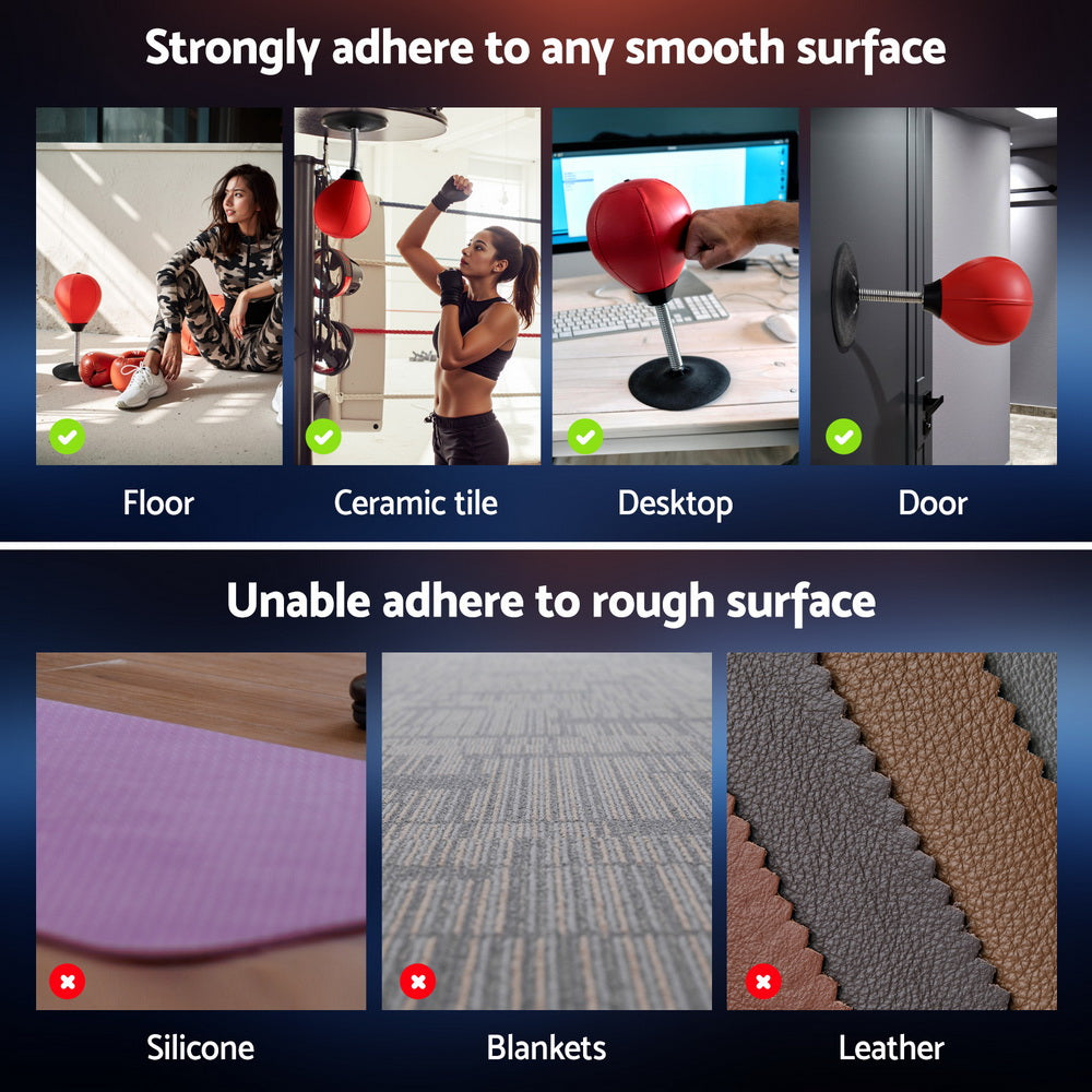 This Everfit Desktop Boxing Set transforms any workspace into an instant stress-relief zone. The vacuum-sealed TPR base grips firmly to desks/tables while the responsive swivel mechanism provides realistic rebound. Perfect for quick focus breaks between tasks, its compact 36cm design fits laptop workstations without clutter. Includes rapid-inflation pump and requires no tools – ready for office or home use in 2 minutes.